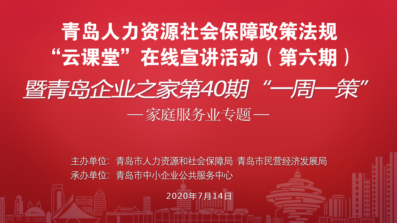 为进一步发挥人社政策惠企惠民效应,让更多家庭服务机构更加顺畅最大化的享受我市家庭服务业政策,市人力资源社会保障局拟于7月14日下午2点30分联合市民营经济局开展人力资源社会保障政策法规“云课堂”在线宣讲活动。宣讲内容为家庭服务业从业人员岗位补贴、家庭服务业就业困难人员社会保险补贴和岗位补贴、家庭服务业稳岗补贴和家庭服务业商业综合保险补贴。
